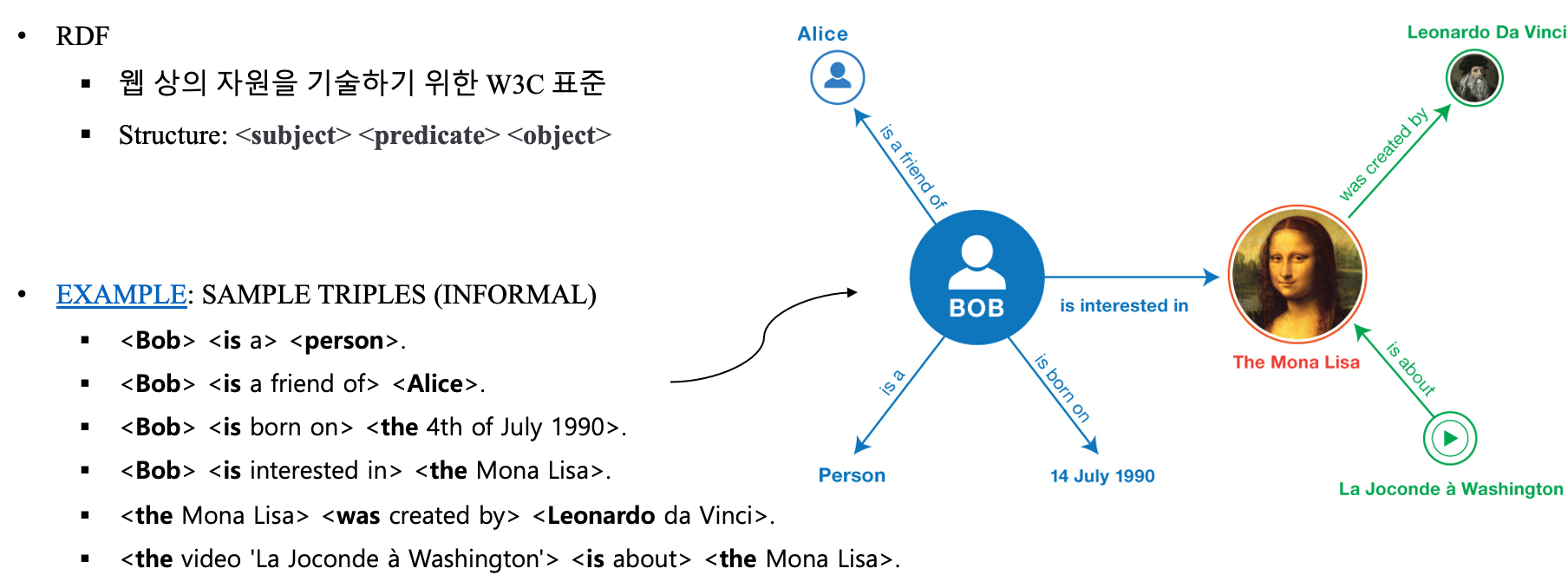 RDF는 W3C 표준 기반 지식표현 모델로, 데이터를 Triple (subject, predicate, object) 구조의 트리플로 표현한다.