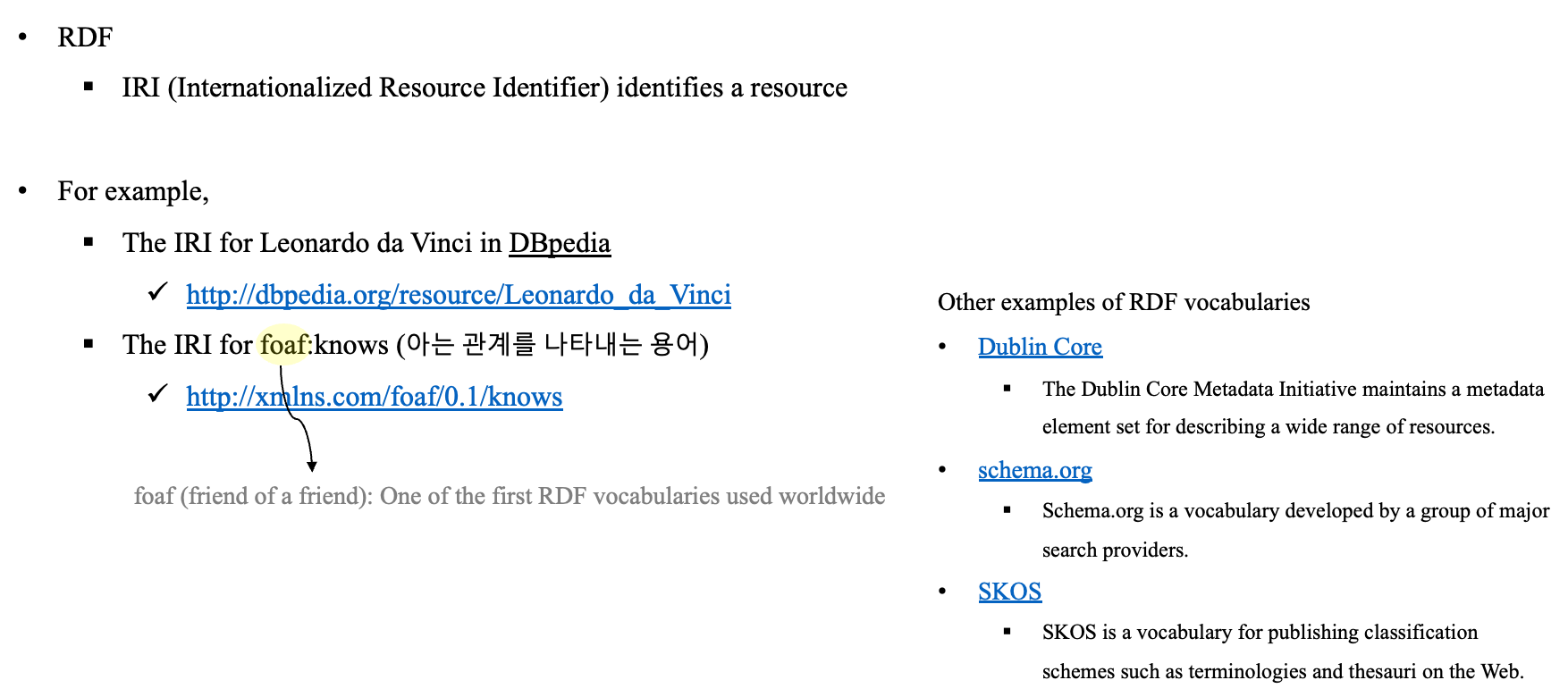 - IRI라는 웹상의 자원을 고유하게 식별하기 위한 국제화된 자원 식별자가 존재하며